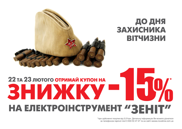 22-23 лютого зробіть будь-яку покупку у всіх гіпермаркетах Нова Лінія та отримайте купон з 15% знижкою на електроінструмент торгівельної марки "Зеніт"!