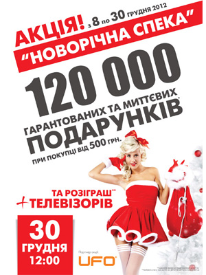 З 8 по 30 грудня, у всіх наших гіпермаркетах купуйте будь-які товари на суму від 500 грн., та приймайте участь в моментальному розіграші цінних подарунків (банні набори, новорічні прикраси, піротехніка, санчата, шуруповерти та багато іншого) та гарантовано приймайте участь у фінальному розіграші телевізора і обігрівача!